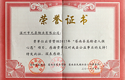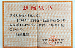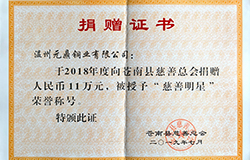 公司多年來一直被評為市、縣成長型企業(yè)、百強(qiáng)企業(yè),功勛企業(yè)等榮譽(yù)稱號。同時公司還成立元鼎銅業(yè)基金會,熱心慈善事業(yè),幫助有需要幫助的人群。特別是幫扶貧困中小學(xué)生讀書和高齡老人。先后榮獲蒼南縣民政局、慈善總會“高齡老人微心愿”、慈善明星等榮譽(yù)稱號...